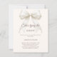 A soft ivory colored background, decorated with a bow with pearls. Personalize and add a name and party details.