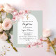 Ein weißer Bogenrahmen und ein schlauer, grüner Hintergrund. Rosa Blume und rosa Bögen. Ein goldenes Kreuz. Personalisieren und fügen Sie einen Namen und Details. 1 Blatt = 1 Einladung mit Druckkante bis Kante.