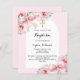 Ein weißer Bogen und ein heller Hintergrund. Rosa Blume und Button verzieren das Zimmer. Ein goldenes Kreuz. Personalisieren und fügen Sie einen Namen und Details. 1 Blatt = 1 Einladung mit Druckkante bis Kante.