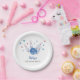 Niedlicher Bowling-Titelsong Junge Geburtstagsparty Papier Platte mit Aquarellbild einer Bowlingkugel trifft einige Buttone mit blauen und roten Sternen fliegen.