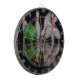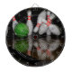 Ein Dartboard mit einem Foto von Bowling-Buttonen.