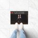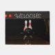 Eine Türmatte mit einem Foto von zwei Bowling-Buttonen, die kurz davor stehen, von einem Bowlingball niedergeschlagen zu werden.