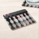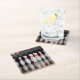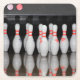 Ein Drink-Untersetzer mit einem Foto eines Racks aus Bowling-Buttonen.