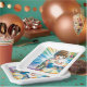 Ein niedlicher Anime-Junge's Bowling Thema Geburtstag Papier Teller. Die Farben sind orange, blau und grün.