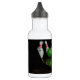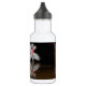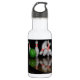 Eine Wasserflasche mit einem Bild einer grünen Bowlingkugel, die in ein Rack aus Bowling-Buttonen schlammt.