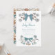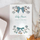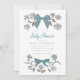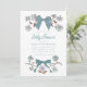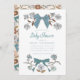 Coquette Bugmode Baby Dusche Einladungskarte mit handgezeichneter Abbildung von Bändern und Blume in blauen Farben.