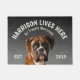 Boxer Personalisiert Hundeliebhaber willkommen vor der Tür. Diese Begrüßungsmatte kann mit dem Namen Ihres Hundes personalisiert werden, der Slogan kann auch geändert werden oder Sie können ein Foto Ihres eigenen Hundes verwenden (stellen Sie sicher, dass es transparent ist). Text liest: Theodore lebt hier... Alle Leckereien begrüßen das Bearbeiten des Designs, um den Schriftart, die Farben und die Hintergrundfarbe zu ändern. Verwenden Sie beim Ersetzen des Hundes ein transparentes Bild. Ein wunderbares Geschenk für ein Party, Ferien, Hundefreunde und für jeden Anlass.