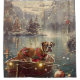 Set segelt mit dieser sehr detaillierten Abbildung in den Zauber der Urlaubssaison und zeigt einen stolzen Hund, der in einem festlich dekorierten Boot sitzt und über einen ruhigen Weihnachtssee gleitet. Die Lichter der nahen Kiefernbäume reflektieren das Wasser und warmen, festlichen Glanz, der das gemütliche Ambiente verstärkt. Die Ornamente versetzen sich von den Seiten des Bootes, während die Laternen leuchten und eine Szene schaffen, die das wahre Wesen der Weihnachtswärme und -freude einfängt. Dieses nostalgische Kunstwerk bringt eine Touch von Urlaubsmagie in jeden Raum, perfekt für diejenigen, die den Geist der Saison schätzen.