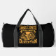 This black duffle bag features a powerful yellow and white graphic related to boxing. The phrases "BOXING", "HARD WORK", and "DEDICATION" are prominently displayed around a detailed boxing glove design. Lightning bolts add an energetic touch, making this bag perfect for athletes or boxing enthusiasts. It's ideal for carrying gym essentials or sports gear. Edit color of the bag caps and body in the Design tool to your favored colors.