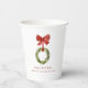 Eine hängende Weihnachtsfeier mit rotem Bogen-Papier-Tasse. Dieser Papierbecher ist mit einem Boxholz-Grün-Weihnachtskranz mit rotem Bogen ausgestattet. Jeder Text kann mit jedem beliebigen Text Ihrer Wahl angepasst werden.