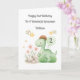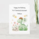 This birthday card is suitable for a grandson or son's first, 2nd or 3rd birthday. The design includes the number 2 (which can be changed or removed), birthday stars, watercolour grass, flowers and rocks, and a green and orange dinosaur with balloon.