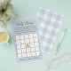 In dieser lustigen Baby-Dusche-Version des Spiels Bingo, lassen Sie Ihre Gäste füllen Sie die Plätze mit Geschenken, die sie denken, die Mutter-zu-werden erhalten. Während die Geschenke geöffnet werden, markieren Spieler die passenden Plätze und der erste, der fünf in Folge erhält, gewinnt das Spiel! Design ist blau mit einem weißen Bingo-Gitter. Ein niedlicher Bär nimmt den freien Platz in der Spielmitte ein. Personalisieren Sie den unten stehenden Text mit dem Namen der künftigen Mutter. Die Rückseite des Spiels ist der Karo des Büffels in Blau und Weiß.