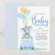 Junge Elefantenbabwdusche mit niedlichem Babyelefant mit Bogen-Krawatte und Ballons auf blauem Wagen und Baby-Blue Dot-Hintergrund. Diese niedlichen Baby Elefant Babydusche sind einfach an Ihre Veranstaltung angepasst, indem Sie einfach den Text Ihrer Wahl hinzufügen.