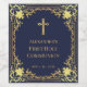 Dieses elegante marinavische und goldene religiöse Design mit Vintager Luft, empfohlen für einen Jungen, hat ein verziertes Imitat Goldfolie Rahmen mit eleganten barocken Dekorationen auf einem marineblauen Hintergrund. Über dem Text befindet sich ein religiöses Kreuz in Imitaten mit Goldfolie. Der Anlass ist auch in Imitat Gold; die Erholung des Textes hat eine goldene Farbe ähnlich dem Imitat Goldrahmen. Der Vintage, verzierte Rahmen basiert auf einer antiken französischen Buchbinderei von Georges Mercier (1885-1939) - Madame de Maupin von Theophile Gautier, Ausgabe 1911, jetzt öffentlich zugänglich.
