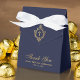 Eine elegante Marine und Gold Junge erste Kommunion Gunst Box. Auf der Klappe hat es Vintages Wappen mit einem Kreuz in ihm, beide aus Imitaten Goldfolie. Die Nachricht Dankeschön ist im unteren Teil geschrieben, in einem eleganten Imitat goldenes Drehbuch, der Anlass und das Datum sind in goldenen Kappen darunter geschrieben. Der Hintergrund ist marineblau.