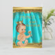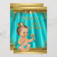 Prince Boy Baby Dusche. Golden Crown Gold Aqua Türkis Aquamarin blau grün, Niedlich Baby Boy Brünett Babydusche. Türkisfarbener Hintergrund und goldener Rahmen. Party Einladung "es ist ein Junge". Party Invites