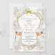 Wunderschöne kleine Jungs in ihren taufenden Kleidern mit goldener Kreuzung. Der Hintergrund für die Einladung ist weißes Satin, goldenes filigranes, goldfarbenes und silbernes Glitzer und Bugverzierung. Die Rückseite ist mit goldenem Blume-Muster und Goldband auf weißem Satin-Hintergrund geschmückt.
