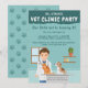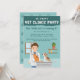 The scene is set against a teal clinic wall with a window and wooden shelves holding small bottles and a plant, creating a cozy little animal clinic. The illustration sits at the bottom of the card, while the top features a darker teal header with space for your party title, followed by room for all the celebration details. The back of the card continues the theme with a teal paw print pattern.