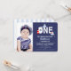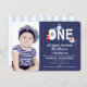 Die nautische Party Einladung dieses Jungen zum 1. Geburtstag zeigt das Wort "eins" in großen Briefen, umgeben von nautischen Elementen, einem Wal, Leuchtturm, Segelboot und Helm. Der Hintergrund ist marineblau und weist ein schwaches Streifen auf. Es ist Platz für ein Foto auf der Seite. Diese Einladung eignet sich als Einladung eines Jungen zum 1. Geburtstag und eignet sich besonders für eine nautische Geburtstagsparty.