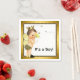 Babydusche aus Hummeln mit niedlichem, dunklem Haar, brünetter Baby-Junge, der ein hübsches Hummeloutfit auf schwarzem und goldfarbenem Hintergrund trägt, mit lebhaften Bienen. Sie können den Text Ihrer Wahl hinzufügen, um diese niedliche Bienendusche zu personalisieren.