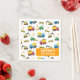 Eine bunte Konstruktion Fahrzeuge Muster Serviette zu diesem Bauthema Geburtstagsparty! Die Serviette besteht aus einem Muster, das mit vielen Bauelementen wie einem niedlichen roten und gelben Müllwagen mit den Schutt, einem orangefarbenen Bagger, einem grünen Frontlader, der Schmutz schiebt, einem blauen Betonmischer, orangefarbenen und weißen Zangen und einer gelb-schwarzen Bauzone-Barriere gebaut wurde. Personalisieren Sie die Party-Nachricht.