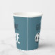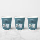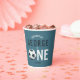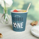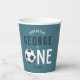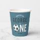 This cute and modern sports-themed kids birthday paper cup design features a blue superstar sports illustration, with a soccer ball making up the word ‘one’. The cup can be personalized with your boys name, and date of the party. The perfect sports-themed addition to your child's first birthday.