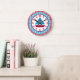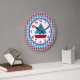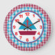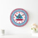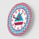 Eine gut aussehende Uhr, die in jedem jungen Jungenzimmer stolz ausgestellt werden kann. Die Außenkanten der Uhr werden in rot und blau Gingham gemacht. Die Innenfläche mit rotem und blauem Segelboot ist in Rot und Blau mit blauen Minuszeichen begrenzt. Die Zahlen sind hell und kühn in einem koordinierenden Rot.