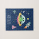 Dieses niedliche und moderne Kinderpuzzle verfügt über einen Raum-Alien-Cartoon, mit einem Raketenschiff, Außerirdischen, Sternen und Mond, und kann mit Ihrem Jungen personalisiert werden. Das perfekte blaue Raumthemengeschenk für jeden Raumliebhaber.