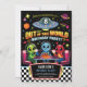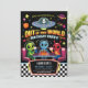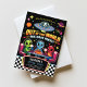 This fun Out of This World birthday invitation features a playful retro space diner theme with cute aliens enjoying birthday cake in a colorful neon 1950s diner booth. Bright stars, planets, a flying UFO, and a bold checkerboard diner floor create a colorful vintage galaxy vibe perfect for a space themed kids birthday party. Easily personalize with your child’s name, age, date, and party details. A great choice for 6th, 7th, 8th or 9th birthday, alien party, outer space birthday, or retro galaxy birthday invitation for boys or girls.
