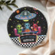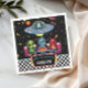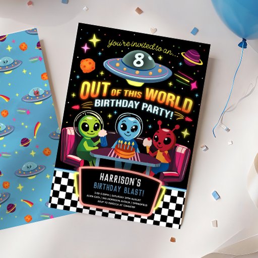 Welcome guests with this fun Out of This World birthday welcome sign featuring cute aliens, a UFO, and a playful retro space diner theme. Neon stars and a classic checkerboard floor add a colorful 1950s galaxy vibe. Personalize with your child’s name and age for a unique space birthday party welcome poster. Perfect as a printable sign for an alien, outer space, or galaxy themed kids party.