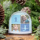 Cool 2 photo personalized Christmas snow globe for the parent of a little boy or toddler. Celebrate your child's 1st birthday with cute photographs of them on this add your own photograph design with cool blue squares. Add their name and age. Place a baby photo on the back.