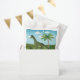 Desteis originelle Cartoon-Illustration einer grünen Farbe Brachiosaurus Dinosaurier stehend in einer tropischen Welt, einschließlich einer Palme, einige Pflanze und grünes Gras. Der Himmel ist blau mit einigen Wolken darauf. Es gibt auch zwei personalisierbare Textbereiche.