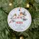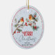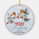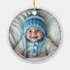 Branch with robin birds and berries Christmas holiday ceramic photo ornament. This charming Christmas design showcases a fir branch with berries and redbreast robins on it. The background is of pale blue color. The phrase "Merry Christmas" combines script and decorative fonts. Personalize it with your own name. The back features a family photo.