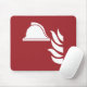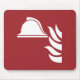 Feuerwehrhelm und Flammensymbol auf rotem Hintergrund.