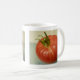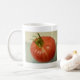 Eine frische Brandywein-Tomate aus der Weinrebe erwartet ihr Schicksal.