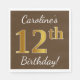Dieses einfache Papier-Serviette-Design enthält eine Nachricht wie "Caroline 12. Geburtstag!", mit dem "12.", das ein Imitat goldähnlich auf einem braunen Hintergrund hat. Der Name kann personalisiert sein. Es könnte auf einer Geburtstagsfeier für jemanden verwendet werden, der seinen zwölften Geburtstag feiert. [~Z0000082]