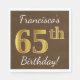 Dieses einfache Papier-Serviette-Design enthält eine Nachricht wie "Franciscos 65. Geburtstag!", die "65." hat ein goldenes Aussehen in Imitaten auf braunem Hintergrund. Der Name kann angepasst werden. Es könnte auf einer Geburtstagsparty für jemanden verwendet werden, der seinen fünfundsechzigsten Geburtstag feiert. [~Z0000082]