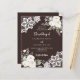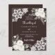Für eine elegante und romantische Hochzeit. Brauner, bisterfarbener Hintergrund mit weißen Blumen, Rose und weißen Spitzen. Personalisieren Sie Ihre Namen und Details und fügen Sie diese hinzu. 1 Blatt = 1 Einladung mit Druckkante bis Kante.
