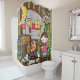 Ein lustiger Duschvorhang zum Thema Camping mit einem Camper im Wald mit einem kleinen braunen Haarbild, das Marshmallows, Lagerfeuer, Zeltschild, Mond, Laterne, Bäume und eine Eule toastet!