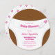 Eine Babydusche mit einem Babywascher auf einem braunhäutigen Baby. Der Text und das Button der Windsicherheit sind rosa. Alle Wörter sind anpassbar. Der Hintergrundfarbe kann individuell angepasst werden.