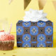Dieses helle Muster weist einen hellblauen Hintergrund mit braunen und marineblauen Quadraten auf. Innerhalb jedes Quadrats ist sternförmig.