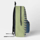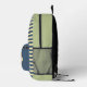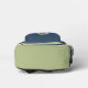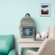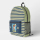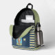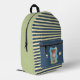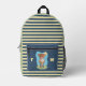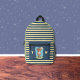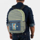 Niedlicher Rucksack für Kinder mit einem lustigen braunen Bären, der eine riesige Eistüte isst. Es hat 3 Hauptfarben (blau, grün und gelb), darunter ein gestreiftes Muster auf der Vorderseite. Personalisieren Sie die Initialen des Kindes . © ArianeC Illustrations-Alle Rechte vorbehalten