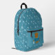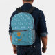 Niedlicher, blauer Rucksack , für den Rückweg zur Schule , mit einem braunen Bären, der eine Angelstange in der einen Hand und einen Eimer voller Fische in der anderen trägt. Die Erholung des Rückens weist ein Fischknochenmuster auf. Personalisiert mit den Initialen des Kindes. © ArianeC Illustrations-Alle Rechte vorbehalten