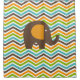 Duschvorhang mit einem braunen Elefanten mit Orangenohren auf einem Zickzack, orangefarbenen, braunen, blauen, grünen und weißen Streifen.