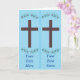 Ein Gemälde mit einem braunen Holzkreuz wird von einer Reihe violetter Blumen mit grünen Blätter umrahmt. Der Hintergrund ist ein heller Himmel blau. Das Design wird zweimal nebeneinander gedruckt, sodass Ihre Grußkarte auch als Lesezeichen dient. Für jedes Lesezeichen gibt es einen Platzhalter für die Vorlage, mit dem Sie Ihre eigene Nachricht eingeben können. Das Christliche Design stammt von CherylsArt.