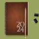 Einfach persönlicher Wochenplaner mit übertriebenem Stacktext und vertikalem Namen über einem Ledertexturabdeckung. Moderne Typografie. Einfache, elegante Gestaltung. Vollständig personalisierbar. Der Planer enthält monatliche Übersichten und wöchentliche Planungsblätter.