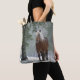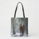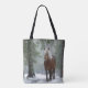 Tote Tasche mit einem Foto eines braunen Pferdes mit einer langen weißen, scheußlichen Mane. Stehend in einem Wald mit Schneeflocken, die überall herumfallen.