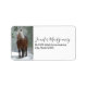 Adressieren Sie Etiketten mit einem Foto eines braunen Pferdes mit einer langen weißen Kakermane. Stehend in einem Wald mit Schneeflocken, die überall herumfallen.
