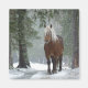 Ein Magnet mit einem Foto eines braunen Pferdes mit einer langen weißen, scheußlichen Mähne. Stehend in einem Wald mit Schneeflocken, die überall herumfallen.