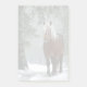 Sticky Noten mit einem Foto eines braunen Pferdes mit einer langen weißen, scheußlichen Mane. Stehend in einem Wald mit Schneeflocken, die überall herumfallen.